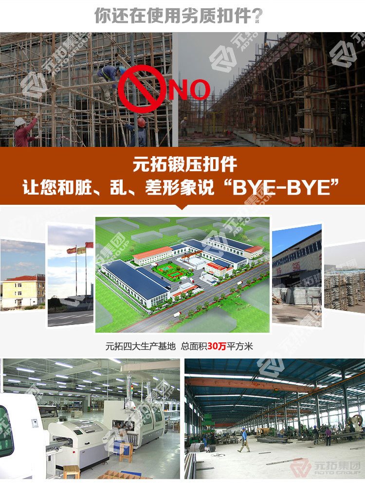 國內做建筑鍍鋅扣件的廠家很多,元拓集團算是做好的廠家之一,元拓建筑扣件種類繁多,規(guī)格齊全,大部門市場上用的扣件類型元拓都有生產(chǎn)銷售,因原材料大批量采購,總體價格還是畢竟好的,買元拓腳手架扣件是很高的性價比選擇。