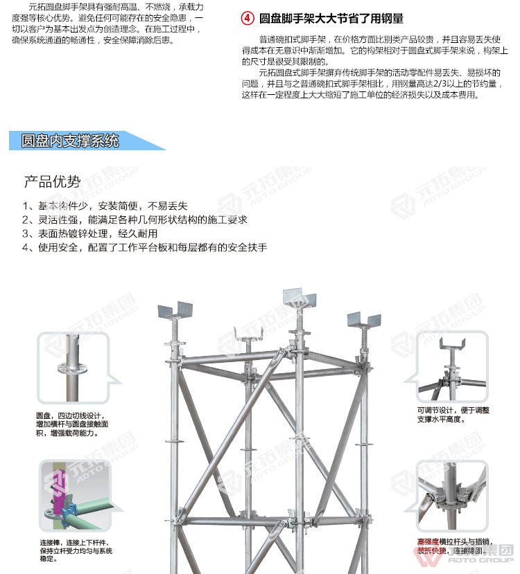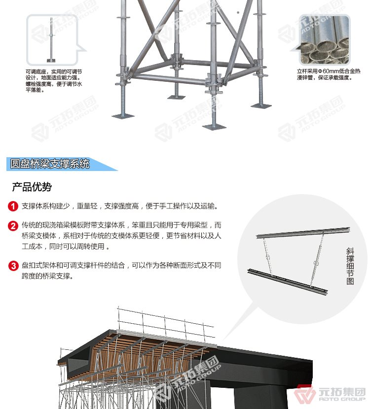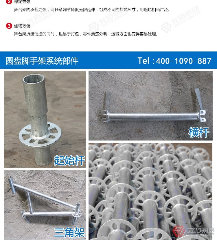 橋梁專用承插型盤扣式腳手架,圓盤式腳手架具有基本構(gòu)件少、架設(shè)及拆卸作業(yè)方便、施工工效高、承載力強(qiáng)等特點(diǎn),被廣泛應(yīng)用于橋梁、隧道、電力、石化、造船、鐵路、機(jī)場(chǎng)、碼頭等工業(yè)及民用建筑的工程領(lǐng)域。相對(duì)于鋼管扣件式腳手架和碗扣式腳手架,圓盤腳手架有不可替代的優(yōu)勢(shì)。