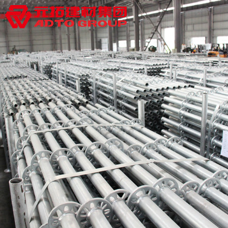 盤(pán)扣式腳手架也叫圓盤(pán)腳手架,主要構(gòu)件有:立桿、橫桿、斜拉桿、頂托、底座、腳手板、梯子等。是一種新型腳手架,廣泛用于樓宇、高架橋梁、地鐵隧道、廠房、舞臺(tái)搭建、室內(nèi)外裝修、大跨度建筑、各類水利工程、船體修造等。元拓腳手架生產(chǎn)的盤(pán)扣立桿產(chǎn)品是用低壓流體高強(qiáng)度焊管(∮60.3X3.2mm  ∮48.3X3.2mm ),通過(guò)全自動(dòng)焊接設(shè)備焊接而成,均使用Q355B低碳合金結(jié)構(gòu)鋼,整體穩(wěn)定強(qiáng)度比其他腳手架提高20%,產(chǎn)品表面采用內(nèi)外熱鍍浸鋅防腐工藝處理,提高了產(chǎn)品使用的時(shí)間,大氣美觀的銀色也為工程晉升了形象。目前國(guó)內(nèi)建筑行業(yè)迅速發(fā)展,特別是近幾年腳手架應(yīng)用的范圍優(yōu)勢(shì),新技術(shù),新材料,新工藝不斷開(kāi)發(fā)并被利用到建筑行業(yè),為建筑行業(yè)提供了更多的新鮮血液。