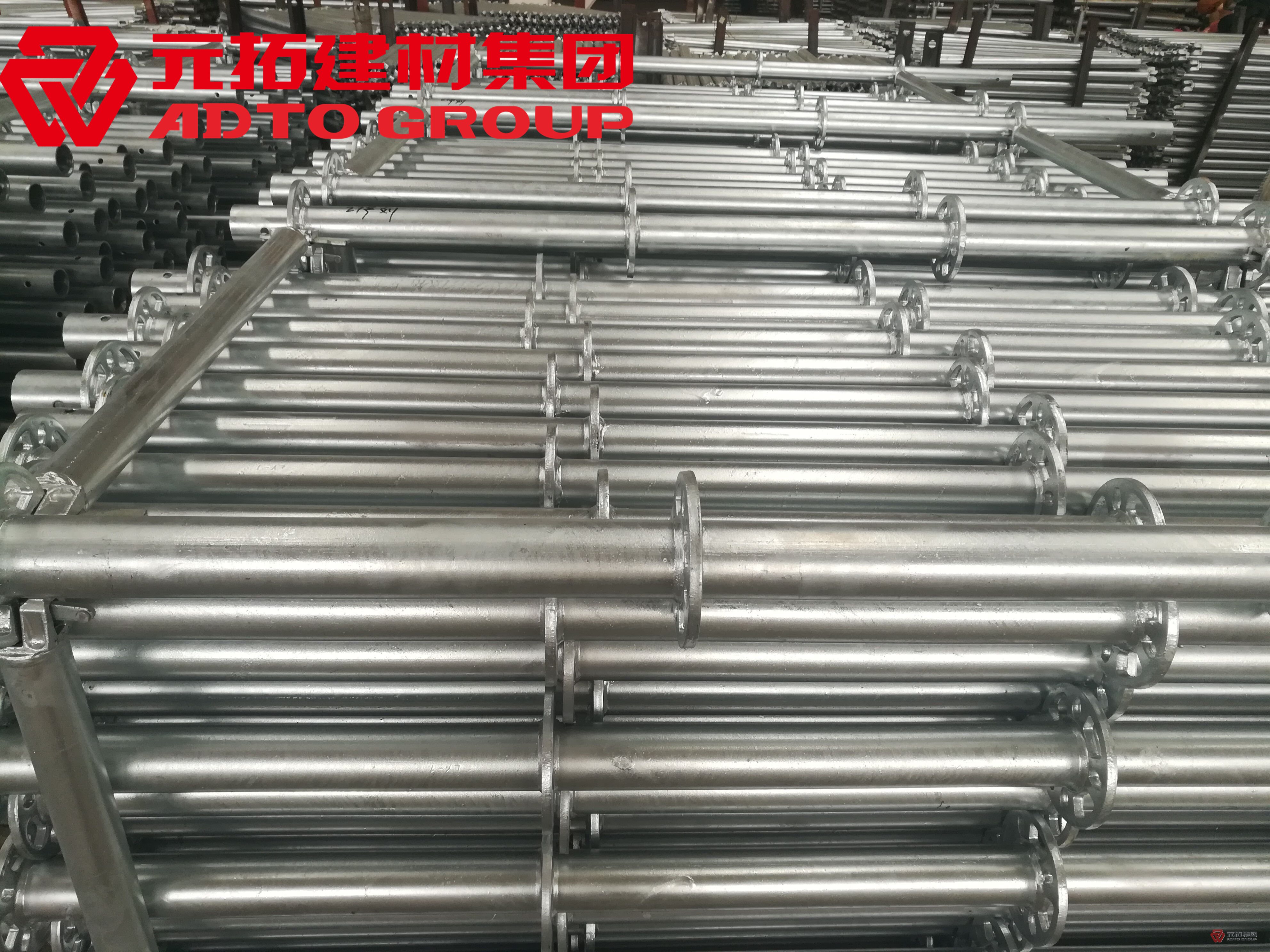 盤扣式腳手架也叫圓盤腳手架,主要構(gòu)件有:立桿、橫桿、斜拉桿、頂托、底座、腳手板、梯子等。是一種新型腳手架,廣泛用于樓宇、高架橋梁、地鐵隧道、廠房、舞臺搭建、室內(nèi)外裝修、大跨度建筑、各類水利工程、船體修造等。元拓腳手架生產(chǎn)的盤扣立桿產(chǎn)品是用低壓流體高強度焊管(∮60.3X3.2mm  ∮48.3X3.2mm ),通過全自動焊接設(shè)備(金獅焊機)焊接而成,均使用Q355B低碳合金結(jié)構(gòu)鋼,整體穩(wěn)定強度比其他腳手架提高20%,產(chǎn)品表面采用內(nèi)外熱鍍浸鋅防腐工藝處理,提高了產(chǎn)品使用的時間,大氣美觀的銀色也為工程晉升了形象。目前國內(nèi)建筑行業(yè)迅速發(fā)展,特別是近幾年腳手架應(yīng)用的范圍優(yōu)勢,新技術(shù),新材料,新工藝不斷開發(fā)并被利用到建筑行業(yè),為建筑行業(yè)提供了更多的新鮮血液。