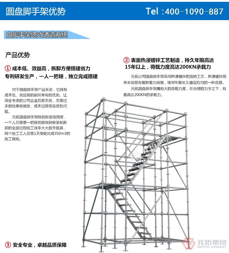 4、品質(zhì)好,元拓盤式腳手架是中國(guó)腳手架領(lǐng)導(dǎo)品牌,是符合標(biāo)準(zhǔn)的安全腳手架產(chǎn)品