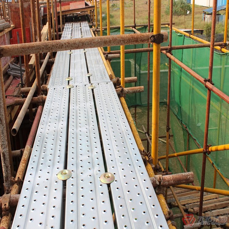 鋼跳板的架設(shè)必須符合施工要求,一次架設(shè)高度不宜超出鄰近連墻件以上兩步。每搭完一步鋼跳板后,應(yīng)按規(guī)定校正步距、縱距、橫距及立桿的垂直度。